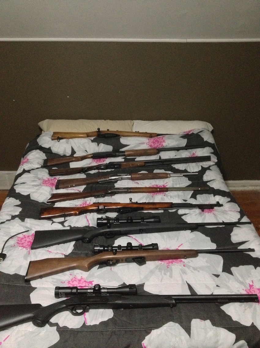 Well, if I was ever afraid of a zombie apocalypse, there is where I would hide.  Yup, under this flowery bed with all of these beautiful firearms.  My buddy had a few of us over the other week and was over excited to show us all his guns.  What made it even more exciting is the fact he was holding a beer with an eerie smile plastered across his face as he pulled each one out of the safe.  No, none were loaded and the ammo was safely locked up so we couldn’t stage a mini war even if we wanted to…but hot damn did it ever get me pumped up for pump action shotguns.  Seriously, after looking at this impressive collection – and handling a couple – I’ve decided to get my firearms licence.  You know…for zombie prevention reasons.  Yeah.