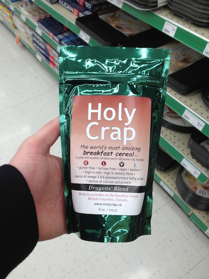 Yes.  You read that correctly.  This is an actual brand of cereal that I came across today while shopping for crap to make for dinner.  So, naturally while searching for crap, I found just that.  Holy Crap cereal, the ‘dragons blend’.  What probably more interesting about this little gem is the instructions to prepare it…  It calls for a teaspoon of almond extract, some (heated) milk, yogourt, granola, and whatever fruit of ‘your choice’.  Right on the package it claims to be free of gluten and sugar, its vegan, and for all you people out there who love Adam Sandler’s Hanukkah song, its also kosher.  Well holy crap!  I think the only ingredients actually IN this package are the instructions on what to put in the bowl.  Seriously, with all the stuff this baby calls for as “additives” you’ve already got yourself a full breakfast.  Just missing the bacon.  Unless you’re Adam Sandler, then its only missing the…schmaltz.  Obviously I had to buy this.