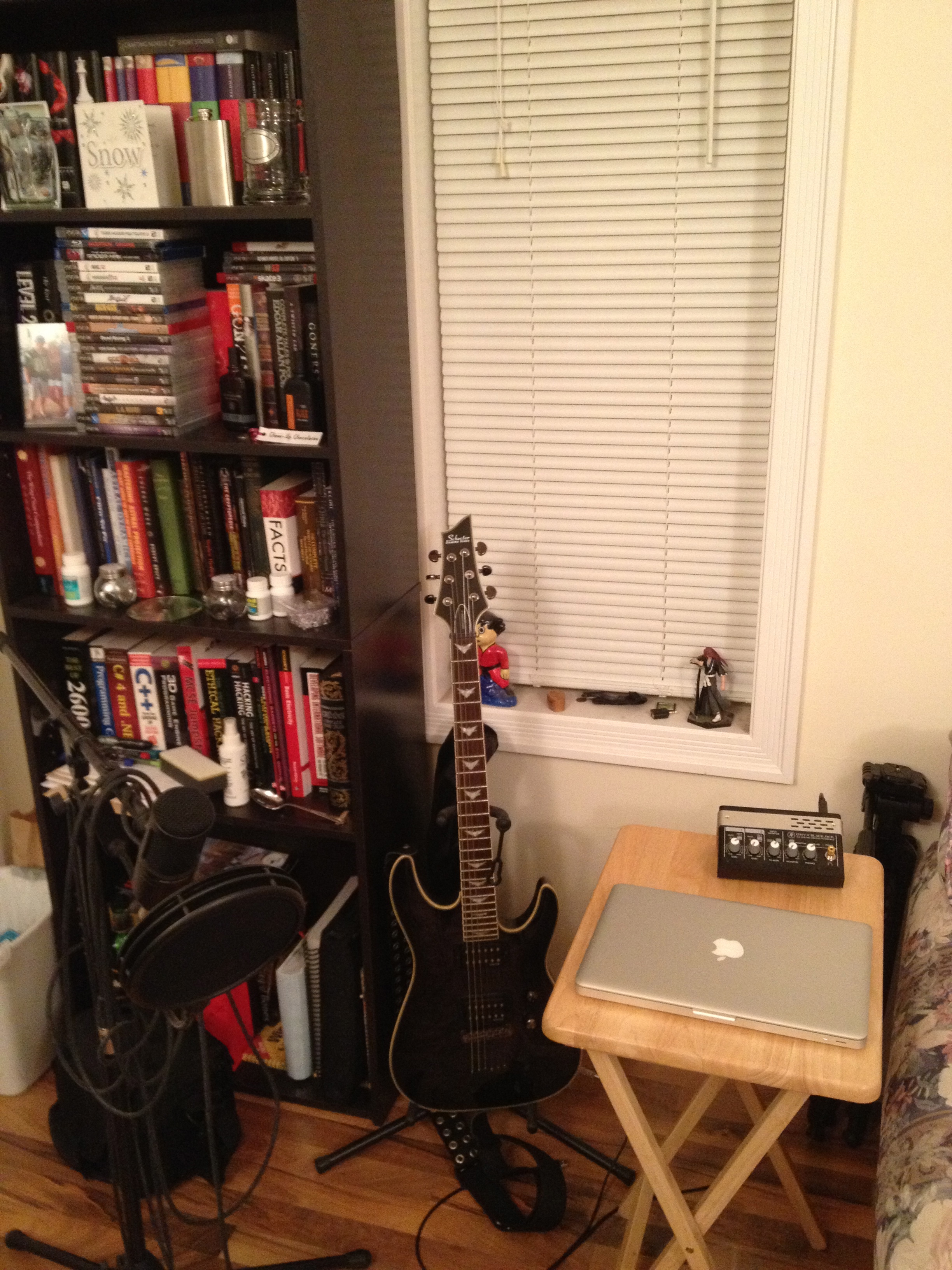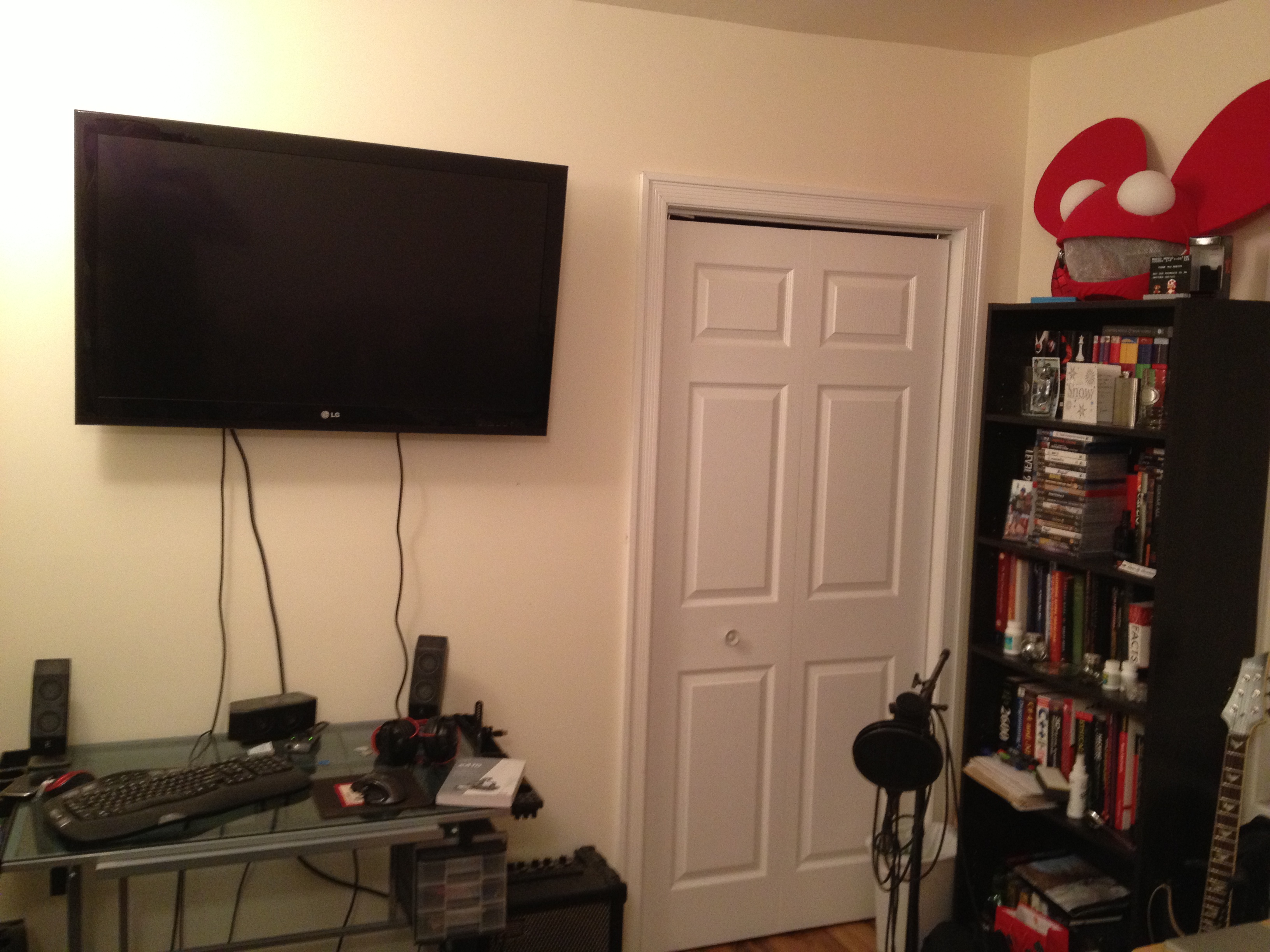 A nice little 42″ TV serves both as a tv for my ps3 and Netflix, as well as a computer monitor so I can read guitar tabs in large print. The Deadmau5 head on top of my bookshelf is an icon of awesome that I made one year for a halloween costume. Now it’s a relic and reminds me of how cool I am.