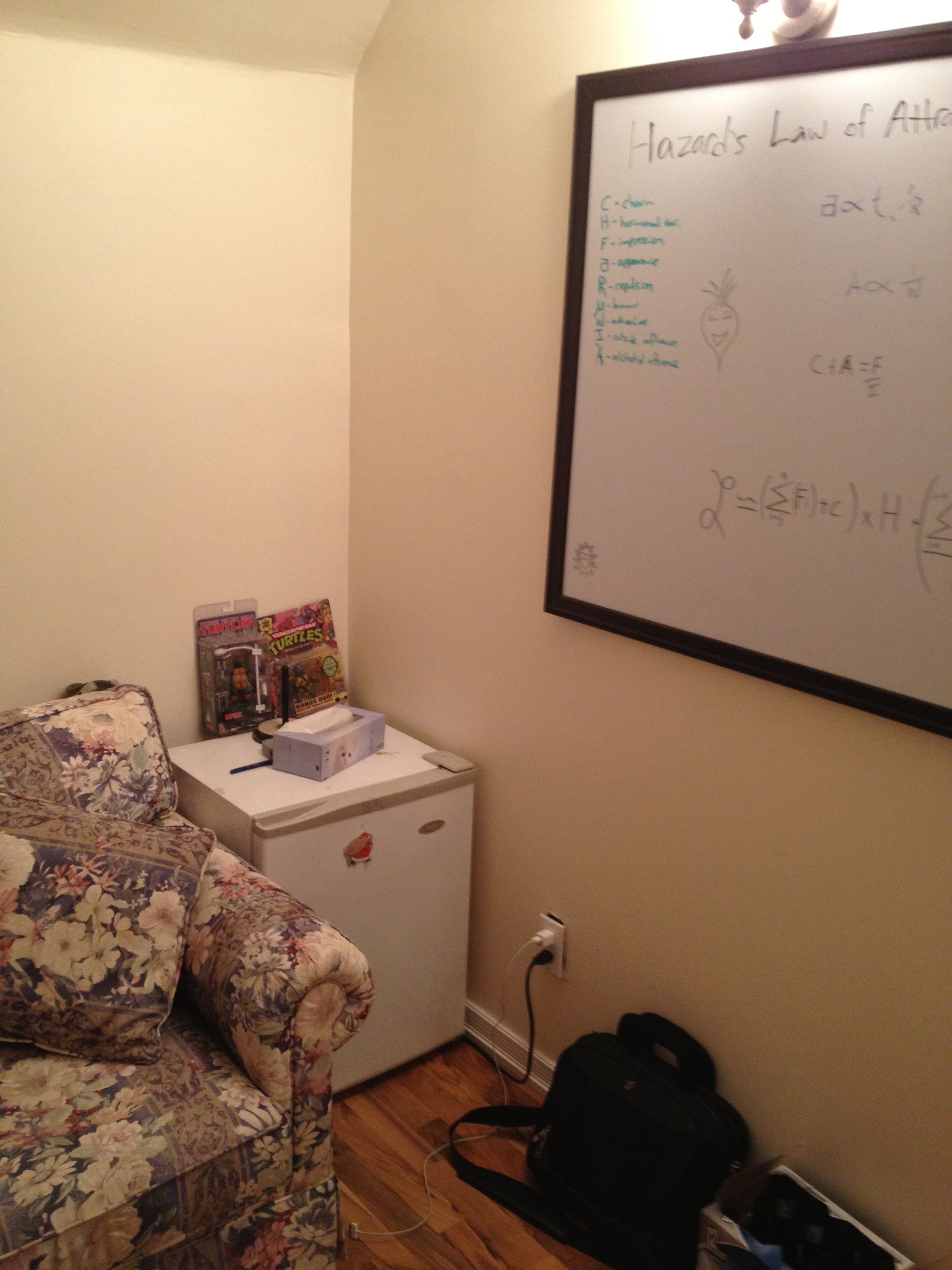 And finally, what would a mancave be without a mini-fridge? Not a good one, is the only accepted answer. The whiteboard on the right is where I do all my scientific work to figure out life. The now infamous “Hazard’s Law of Attraction” is still up there, now an iconic equation that’s solidified its place in history.