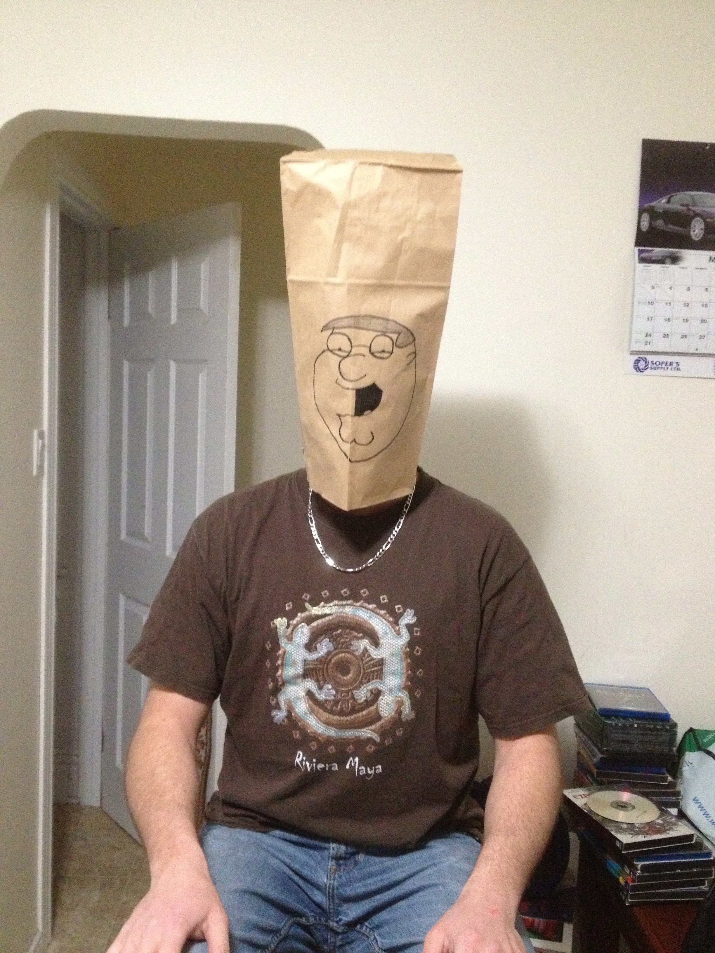 This could be the reason for the animal neglect…I have wayy too much fun at home on my own without the need of furry company. I honestly don’t know what inspired me to make a Peter Griffin mask out of a paper bag, but probably had a bit to do with the fact work has been so bloody boring as of late that I spend my 8 working hours doing Seth Macfarlane voice overs. Now I’ve got a face to go with my Peter impression. All I need now is a Stewie mask and I’m set!