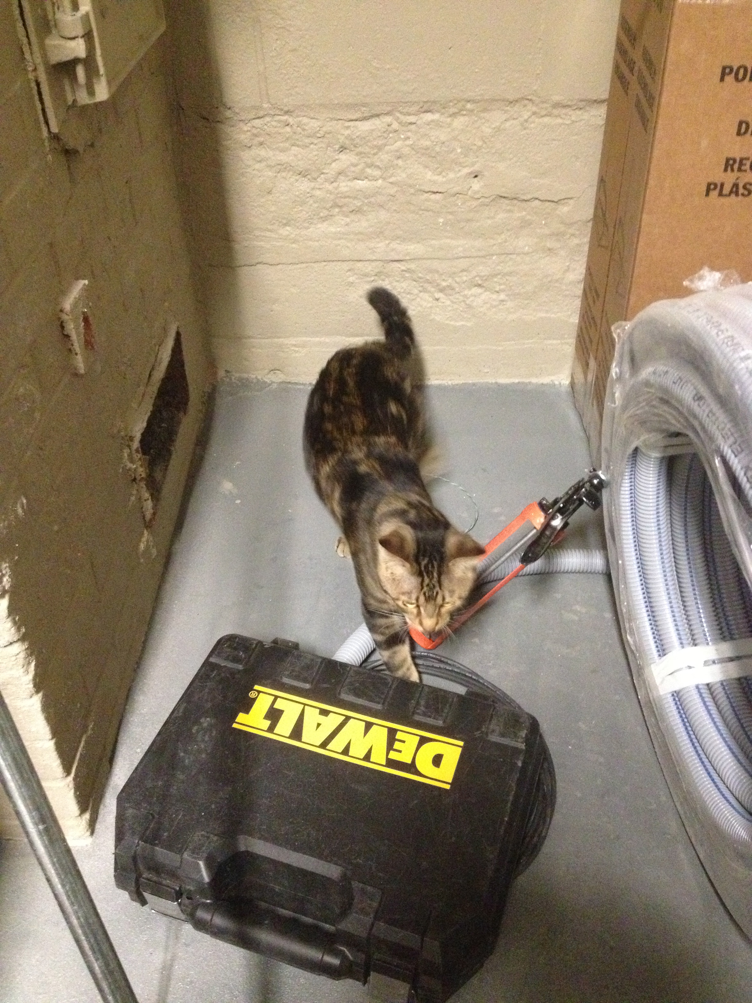 Work has been…interesting. I’ve been sent to a low income housing site where I’m installing – well what I’m installing isn’t important, its boring and monotonous, so I’ve made friends with the locals. As you can see here, Cheeto – aptly named by yours truly – is chilling in the maintenance room with me while I teach him how to properly use a cordless drill. He was very impressed, as we sat and chatted for about an hour before his owner came in and asked what the hell we were doing. Some people can’t appreciate a good friendly visitation. Jerks.