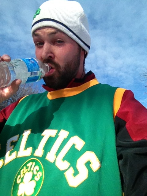 This was shot right after I crossed the finish line and grabbed a way overdue water. Normally I’d prefer a beer, but nothing felt better than that bottle of water knowing I’d finished the first of many races for the year. The best part of this whole event was how so many people were wearing Boston attire…note my fancy vintage Celtics jersey. There was an entire assortment of Boston gear sported by almost everyone who showed up to run – most of them Bruins hockey jerseys. I was the only one who actually had a basketball jersey; apparently theres no situation where I don’t feel the need to stand out.