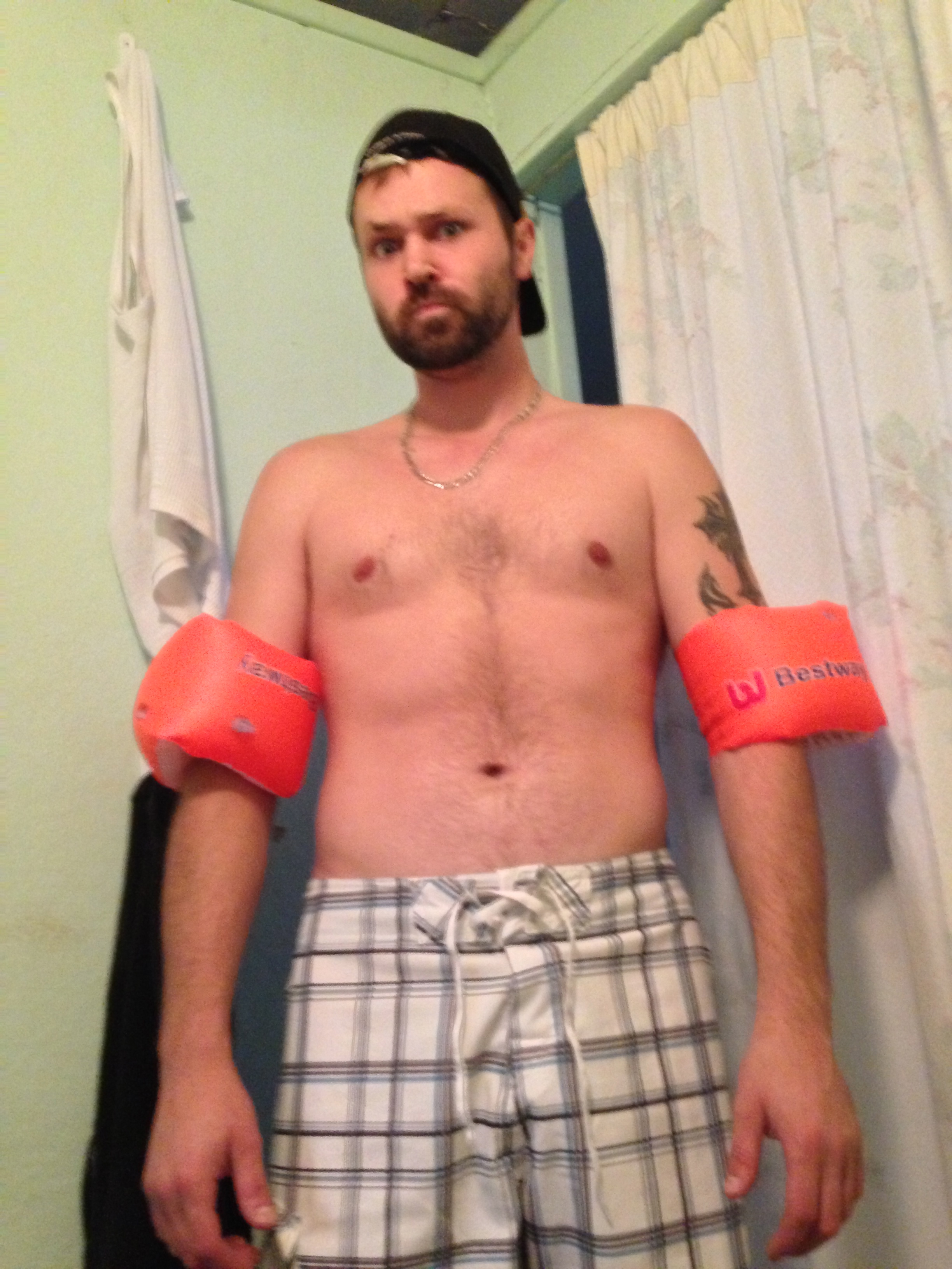 Realizing the immediate danger of wanting to swim in the lake without the presence of a life jacket, I found myself a less fashionable replacement. On a positive note, there were no women around to see how ridiculous I looked. The downside? Totally forgot about the lake and sat in the hot tub with these puppies on for an hour and lost circulation in my arms. Creativity is a curious tool.